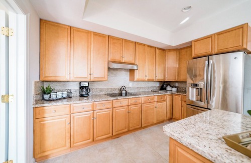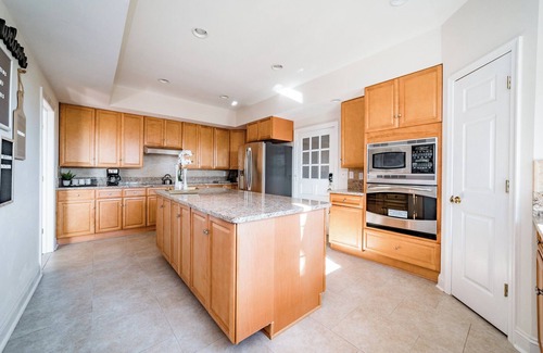KITCHEN: huge island, stainless appliances (oven/range, microwave, dishwasher, fridge), Keurig & regular coffee maker, pots/pans, dishware, glasses, and everything needed to make basic meals.