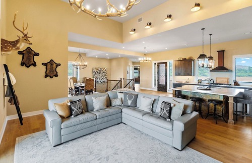 Inside the lodge, you'll find a haven of comfort and luxury, boasting oversize balconies and patios, all with magnificent views. A large modern kitchen, with all new KitchenAid appliances, is fully stocked for gourmet meal preparation. Complete laundry facilities are also available including a commercial scale washer/dryer combo. The six spacious bedrooms (including a Bunk Room) are meticulously designed for rest and rejuvenation, featuring 4 King beds, 1 Queen bed, 1 twin and 3 twin-over-queen bunk beds to accommodate groups of all sizes. Each bedroom is equipped with a large screen TV, ensuring that every guest can unwind in style.