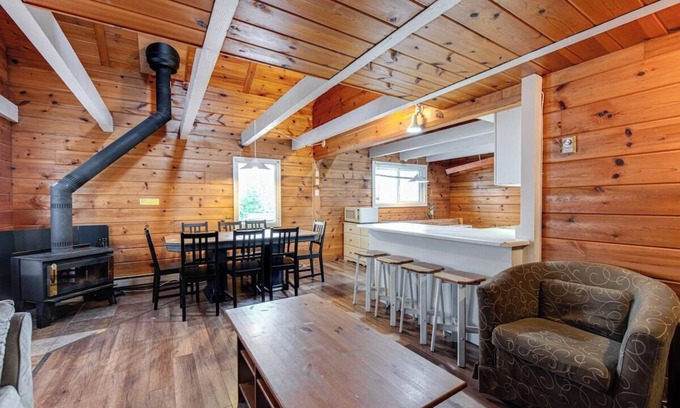 Chalet with capacity for 10 people. Located in the heart of an isolated 120,000 sq. ft. forest and two minutes from the bottom of the slopes of Mont Saint-Anne, it is the ideal place for a weekend of skiing with friends, a -to the shoulder between colleagues, or a training camp between teammates. Perfectly equipped, everything is there to have a good time with the people you love! Terrace facing Mont-Sainte-Anne with a view of the slopes in winter. Take advantage of the spa to relax.