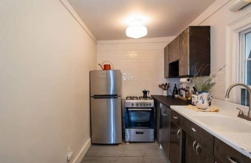 This charming three-story townhouse, just two blocks from vibrant Warren Street, is perfect for families, friends, or a romantic getaway. Apartment 2 offers 1 bedroom, 1 bath, and accommodates 2 guests. Enjoy cozy thrifted decor, a private balcony, convenient parking, and a fully equipped kitchen with a dining table for six.