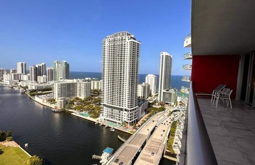 El apartamento tiene acceso a una espectacular piscina sobre la intercostal, desde donde podrá disfrutar de una vista de barcos más grandes de Miami navegando por este bello canal.
