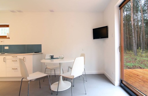 The kitchenette is fully equipped it has electric hop, fridge, microwave, washing machine, electric kettle. All you need to prepare the meal. There are dishes and cutlery for six people. In salon there is comfortable sofa bed, armchair and dining table, TV set.