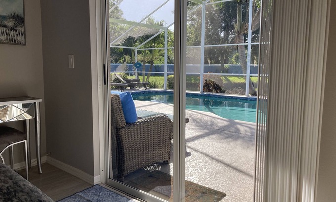 While not at the beach, golfing, or enjoying other thrills in the Sarasota/Bradenton area, the home itself is a true oasis. Open floor plan with morning sun rising over the lanai beckons for you to start your day poolside sipping your coffee or tea. Deep seating, bistro tables, comfy lounges, cornhole, pool volleyball, and BBQ make for fun and memorable gatherings. Watch your kids play in the pool while you cook or lounge inside the house or out, or see them fishing in the lake while you bask in the sun or pool. The lanai and lakeside view is accessible from the large, open-concept great room, where you can enjoy gathering around the TV with unlimited WiFi, or a good game of super-sized Jenga.