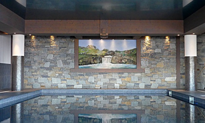 - Covered / heated swimming pool (29 °) with view on Mont Blanc + terrace with deckchairs