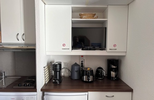 Au calme, l'appartement se compose d'une entrée avec coin montagne équipé de 2 lits simples superposés séparé du séjour par une porte coulissante, un séjour avec cuisine ouverte équipée et coin repas, une chambre alcôve fermée avec lit double de 140, une salle de bain, un wc séparé.
