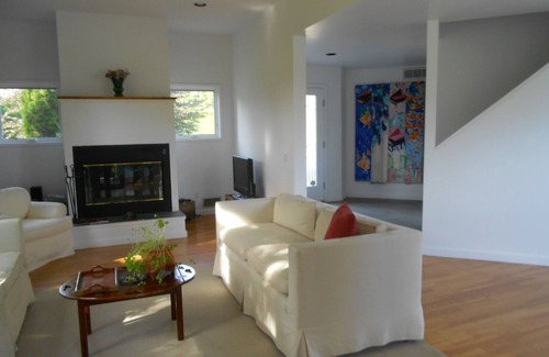 There are three private suites- master suite has a huge bathroom with jacuzzi and shower as well as private covered deck; other 2nd floor suite is remote from master and has large bedroom and small single person bedroom; ist floor suite has large bedroom and sitting room or office and bath which is used by common spaces as well. There is an open plan living, dining and kitchen. There is a shaded patio off the living room and another patio off the kitchen which overlooking the heated pool. There is a garage which is partially available for guest use. There is an unfinished basement. This house is in a very prime location, halfway between the ocean and the village.