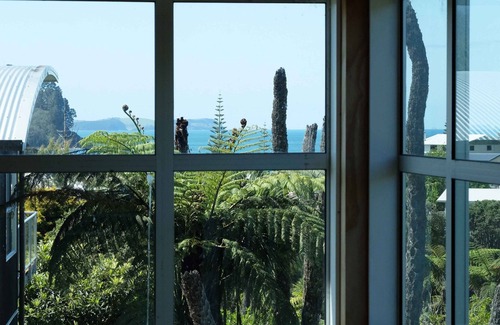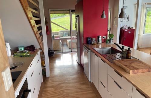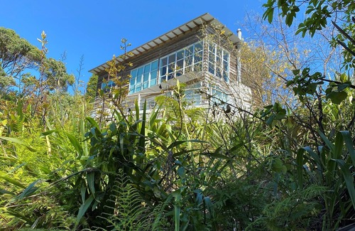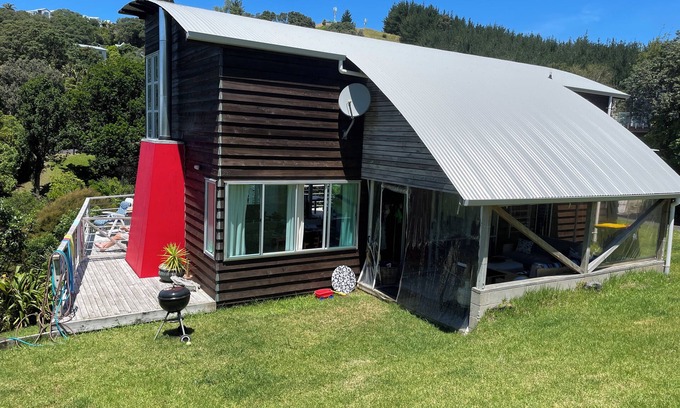 Onemana is a small beach resort with lots of bush, birds and secluded spots. Our Nahoon Bach (sleeps 7) was designed by owner Paul (wannabe architect) with a vision of it being a unique beach abode rather than a suburban home. The living area is a two story void surrounded by double story windows making it light and airy with beautiful bush and sea views. All windows can slide open on hot summer days giving it a "tent-like" feel. Its curved corrugated iron roof (inside and out - insulated) and structure is reminiscent of the iconic Kiwi barn. Oneama has a beautiful white sand surf beach - although sometimes the sea is more is like a peaceful lake. There are lots of great bush walks to remote neighbouring beaches. If you want a bit more action, Whangamata is only 10 minutes drive away. Other Coromandel attractions like Hot Water Beach and Cathedral Cove are an hour's drive away. Onemana has free tennis courts if you can drag yourself away from the deck where you could sit for hours watching the Tuis and enjoying their songs from the bottle brush and Kauri or admire the Kingfisher sitting in the Punga. At night you can hear the Morepork calling and the crashing of the surf (when it's up). It's an idyllic retreat from city life. In winter there's a roaring log fire to add to the ambience and comfort. The house has all the mod cons and is furnished in an eclectic mix of Kiwi and African design and art.