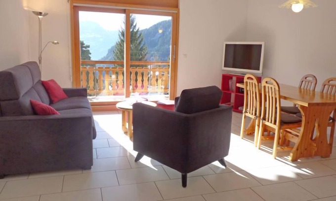 "Ardévine 5", 2-room apartment 60 m2, south facing position. Comfortable and modern furnishings: living/dining room with 1 sofabed and cable TV. Exit to the balcony, south facing position. 1 room with 1 x 2 bunk beds (90 cm, length 200 cm), 1 french bed (160 cm, length 200 cm). Exit to the balcony, south facing position. Open kitchen (oven, dishwasher, 4 ceramic glass hob hotplates, electric coffee machine, raclette grill, fondue Set (cheese)). Shower/WC. Large balcony 17 m2, south facing position. Terrace furniture. Very beautiful view. Facilities: Internet (WiFi, free). Parking (2 cars). Please note: non-smokers only.