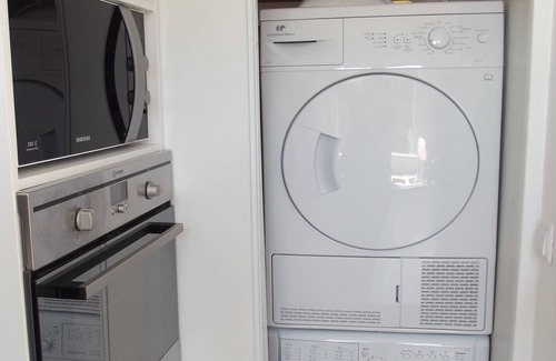 -American Kitchen with oven, dishwasher, washing machine, dryer, microwave, refrigerator, freezer, induction hob, coffee machine and electric toaster.
