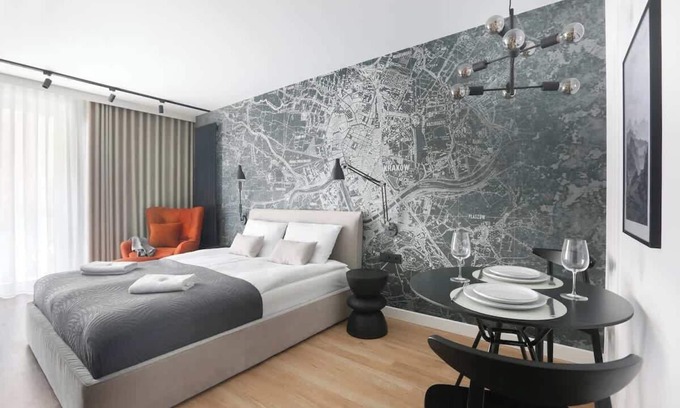 Beautiful, fully equipped studio of high standard can accommodate 2 people. It is therefore the perfect solution for a romantic getaway! The apartment consists of a living room with a double bed, a kitchenette and a bathroom with a shower cubicle. The living room also has access to a cozy balcony equipped with garden chairs, overlooking the inner courtyard of the estate, where you can enjoy a sip of morning aromatic coffee. The studio has an irresistible charm, thanks to its elegant design and high quality materials. The entire interior, designed by an extraordinary architect, catches the eye with its magnificent style, and the original wallpaper with a map of Cracow introduces a metropolitan character. Harmonious design and attention to detail will satisfy even the most demanding guests. A wide range of amenities and comprehensive equipment of the apartment in the necessary accessories and kitchen and bathroom equipment guarantee the comfort of your stay. An unparalleled gem is the heated mirror in the bathroom, which prevents fogging during bathing. Guests can take advantage of a welcome set of toiletries (soap, shampoo and shower gel), towels, linens and a wide range of household items, such as an iron and vacuum cleaner. Multimedia facilities include a backlit flat-screen TV and free Wi-Fi access.