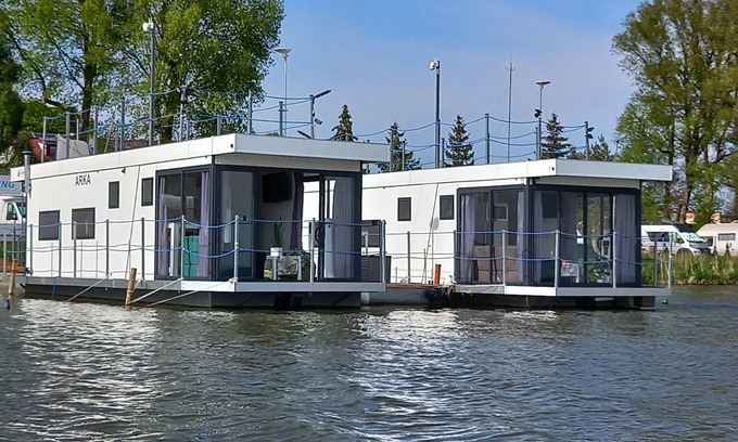 Masz okazję spędzić wakacje na zupełnie nowych 2 łodziach mieszkalnych „ARKA”. Łodzie mieszkalne są odpowiednie dla 2 do 4 osób. Oferuje około 32 m2 powierzchni mieszkalnej plus 25 m2 tarasu na dachu. Wnętrze: otwarty salon z wyposażoną kuchnią ze zlewem, lodówką, kuchenką mikrofalową, kuchenką gazową, naczyniami, garnkami, sztućcami, odkurzaczem itp. Jadalnia z pięknymi widokami, wyposażony w rozkładaną sofę dla 2 osób, stół barowy 2 krzesła, TV.