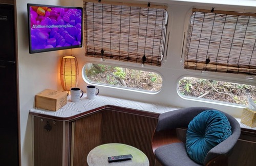 1971 Vintage Airstream Recreational Vehicle, complete with kitchen, bathroom with shower, smart TV and WIFI. This unit also includes gas grill, firepit and deck with private hot tub. The Arlo Airstream sleeps up to 4 guest with with two twin beds and a pull out sofa bed.