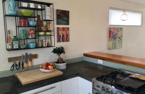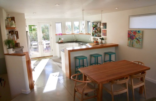 Offering mountain views & breezy indoor/outdoor flow, this airy retreat will immediately put you in Vacation Mode. Filled with natural light and a curated playful style, the Artful Abode is an ideal property for larger groups that need space to spread out & relax. Very livable and family friendly, this property also works well as a location to collaborate, mixing business with pleasure. If you're into design, you should be happy here: custom artisan details, an eclectic mix of vintage & modern furnishings & a playful art collection create a pleasant and relaxing environment. Enjoy up-close mountain views from the Living Area & Front Porch. Watch the sun set over Mt Sanitas on the turfed roof deck. Ditch your car keys -- you can easily walk/bike anywhere from here. Feeling lazy? Uber typically shows up in 5 minutes.