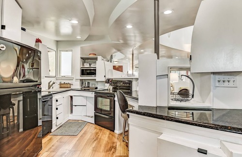 The kitchen inside Design on Duffy can be described as an artistic wonder. A glistening bar-style island with seating for three divides the kitchen from the rest of the home. Guests are invited to make full use of a wet bar with mixology essentials. Aside from being a beautiful space, this kitchen is also a chef's dream! It boasts a full-sized refrigerator, stove, dishwasher, microwave, toaster, and coffeemaker. The kitchen's natural-stone countertops glisten over contemporary-style white cabinetry. A table for four provides a conventional place for sitting down for a meal in a kitchen that defines convention! The home's smaller bathroom and laundry area are conveniently located right off of the kitchen.