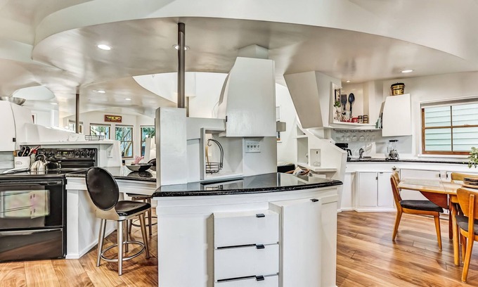 One of the delights of staying at Design on Duffy is the way this home tells a story within every detail. The home boasts unconventional angles, built-in shelves, one-of-a-kind doorways, and curved walls. Enter through a colorful living room featuring comfortable seating positioned around a smart TV. A wall of windows in the living room adds cheerfulness to a space that is defined by fresh white walls peppered with bold artwork. Design on Duffy also stands out for being one of the best Savannah vacation rentals for someone who needs to "work from home" while traveling. A huge built-in workspace featuring a desk with room for several people is centrally located in the home. Guests will also find several "work nooks" throughout the house that are perfect for sneaking in some laptop time.