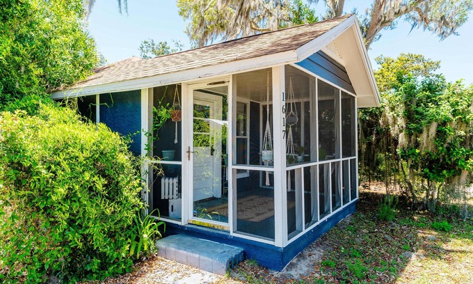 Inside, you'll find colorful bedrooms and calming, artsy decor that brings a sense of relaxation and creativity to every room. The thoughtfully curated, bohemian touches create a welcoming atmosphere, perfect for unwinding after a day by the bay. The bungalow also features a fenced-in backyard, private driveway, and a screened-in front porch ideal for enjoying the fresh air. The covered back porch offers additional outdoor space for dining or simply soaking in the tranquil surroundings.
