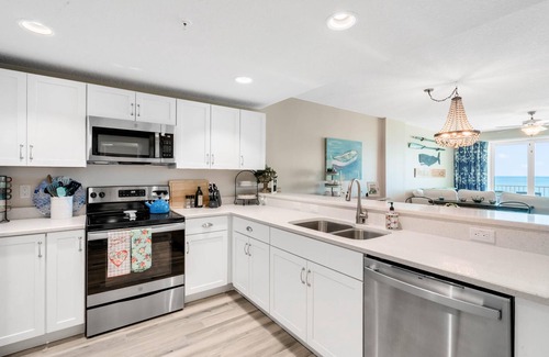 You will fall in love with the views and the open layout of this 8th floor condo. An incredible 3 BR unit with water views from every bedroom. The balcony is large enough for the whole family to relax and has a great view of the beach/ocean as well as the pier just 3 buildings down with restaurant/bar/fishing pier. Enjoy dining outside with sweeping ocean views from the table. There are incredible views from the balcony, the master bedroom and the family room. The master bedroom boasts an incredible direct oceanfront view with a King Bed. The Kitchen features quartz counters and stainless steel appliances. I has all the amenities you would want including a Keurig, flat screen TVs and high speed internet. The kitchen overlooks the great room which features a flat screen smart TV. The other 2 bedrooms both have incredible wide river views. The 2nd BR has a King Bed. The 3rd bedroom original sleep chairs were removed, owner added 2 twins or together as a King via conversion kit. (tenant can chose which option they want ahead of time). to allow sleeping up to 6 in the unit. The Aruba condo building is the newest on the beach with construction completed in February 2021. The pool is heated year round and the hot tub, club room, fitness center round out the resort style amenities. Bedrooms - Master/King, 2nd King, 3rd BR/either King or 2 Twins.