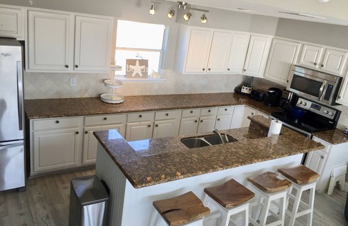 The open-concept living room has a new oversized sofa and 2 new comfy chairs. The dining area offers a dining table with 4 chairs and a dining bench and 4 swivel barstools at the kitchen counter/bar. The well-equipped kitchen has new custom-built upper cabinets, PLENTY of counter space, dishes, glasses, a large assortment of pots and pans and items needed for cooking and baking, lots of outdoor-friendly cups, dishes, and serving pieces, as well as many appliances to accommodate everything from your morning Keurig or freshly brewed pot of coffee to your favorite frozen beverage in a VitaMix blender.