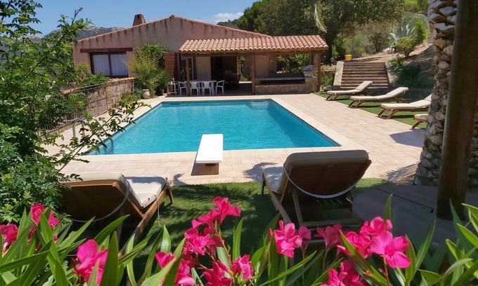 Beautiful villa located on a hillside on a plot of 5000 m2 in a green and very quiet by nature. It offers exeptionnelle panoramic sea views and unforgettable sunsets.