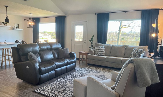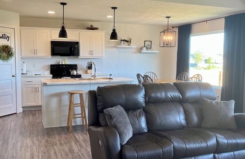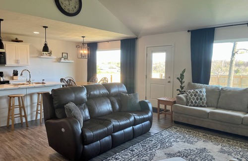 This modern, 3 bedroom home boasts vaulted ceilings, large windows, ceilings fans, spacious living area, a large fully fenced back yard and a host of amenities for a delightful stay. I have taken care to provide quality linens, a well stocked kitchen and great board game options. The master suite is located on the opposite end of the house from the other 2 bedrooms and bathroom. You’ll find the spacious living room and kitchen have an open floor plan and are an excellent place to visit or dine together. The cozy leather sofa across from the large flat screen TV has 2 recliners, making for a great movie night.