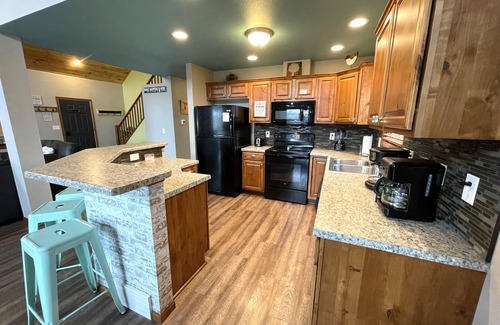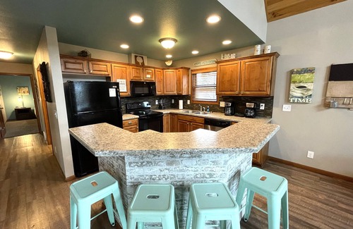 The main floor offers two bedrooms (one with a king, the other with two queens) that share one of three full bathrooms. Lounge your vacation away in the spacious living room which is adequately furnished with comfortable seating, a sofa sleeper and a large flat screen TV. It also opens up to the dining area where guests will enjoy the ultimate dining experience at the table for 14 people. The dream kitchen features slate appliances and seats six more at the counter. The open concept, common area is accented by knotty pine cathedral ceilings, a large stone wall fire place and ample room to relax comfortably.