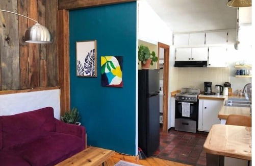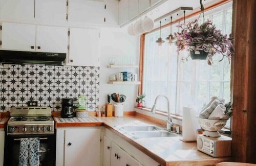 Wonderful big windows let in lots of natural light into the kitchen and sitting area. The bedroom is very cozy and heats up wonderfully with a woodstove. Firewood is provided for your fires:)
