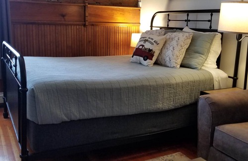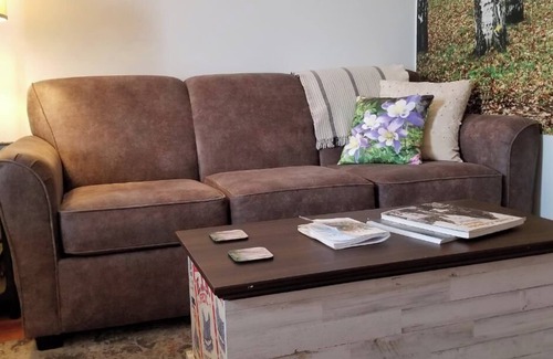 We hope you find relaxation in the comfort of a queen bed, a queen-sized pull-out couch, and a cozy electric fireplace. The bathroom is equipped with a shower/bath combo, towels, hair dryer, and other essentials.