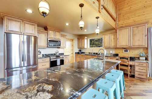 Modern Kitchen: Fully equipped with granite countertops, modern appliances, and a large island—ideal for preparing meals for big groups.