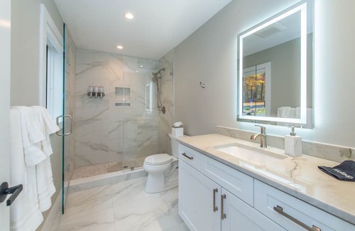Built in the summer of 2022, this Aspen-Style home is Sparta's newest weekend getaway. This hidden gem is located just steps away from wedding venue Rock Island Lake Club, offering a convenient stay for RILC couples and their wedding parties.