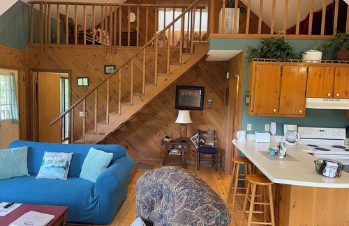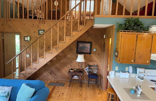 Aster has a king bed on main level with a bedside jetted Jacuzzi tub in room, as well as a large loft area with queen bed and a sleeper sofa on the main level. Full bath on main level. All bed and bath linens provided. Full kitchen with bar and dining area. Great room with stone wood burning fireplace (seasonal use only), Roku Streaming TV. Scenic views on large porch with rockers, porch swing, and charcoal grill on front porch. We also provide directions/links to help guide you from your cabin to area waterfalls, hiking trails, wine vineyards, restaurants, Georgia Mountain Fairgrounds, and other seasonal events and activities nearby. We have a five person maximum in Aster cabin.
