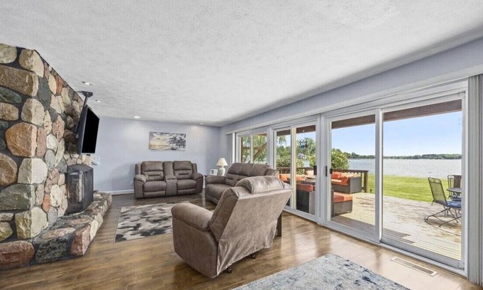 This adorable cabin in Lake Odessa is a cozy retreat for guests looking to relax and recharge. With 4 bedrooms including 2 king beds, 2 queen beds, and more, there's plenty of space for everyone to unwind. The 3 bathrooms with showers ensure convenience for all. Whether you're lounging in the living room or enjoying the fresh air on the patio, this cool cabin offers a tremendous escape from the hustle and bustle. It's easy to see why you'll be able to unwind at our place. This gorgeous home sits on nearly an acre with 250 feet of Lake Frontage, a Steel Seawall, and a Very nice Beach Area. The property features an indoor fireplace, an outdoor kitchen, huge deck area, a custom outdoor fireplace as well as zoned heat and a/c indoors. The home has very nice landscaping, a new roof, large shed, fire pit with surrounding patio and a hot tub. A All new cabinets and counter tops 2 years ago. The home is situated on a cul-de-sac.