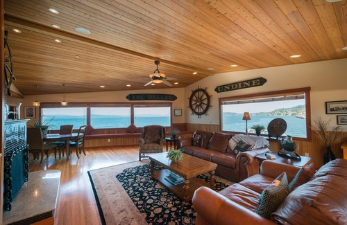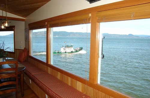 Located on upper level of the historic Pier 14 Pilot Station (still operated by the Columbia River Pilots) the Pilot House is an elegantly appointed luxury suite in the heart of Astoria's historic waterfront. Surrounded by water, nearly every room offers a panoramic view of the Columbia River. The dock is a 24 hour working dock, with pilots and pilot boat coming and going. (There is noise from pilot boat starting and pilots coming and going all night)