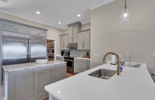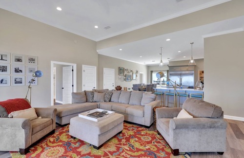 This beautiful new beach-front home features fantastic views of the Gulf of Mexico. The large open floor plan is perfect for families. The main primary bedroom faces the gulf and has a king bed and access to the deck. The ensuite has a large soaking tub, double vanities and a large glass shower. Beachfront primary bedroom two has a queen bed, private bath and deck access. Beachfront primary bedroom three also has a queen bed, deck access and a jack and jill bathroom that connects to the bunk room. Bedrooms four and five have queen beds and their own bathrooms. The bunk room has a full/twin bunk and is perfect for kids! Both street side bedrooms have queen beds and private baths. The fully equipped kitchen features two ovens, a dishwasher and over-sized built-in counter depth refrigerator/freezer. No icemaker. Speed queen washer/dryer. 10 to 12 people MAX. Pets NOT allowed- owners child has allergies. Parking for 6 cars.