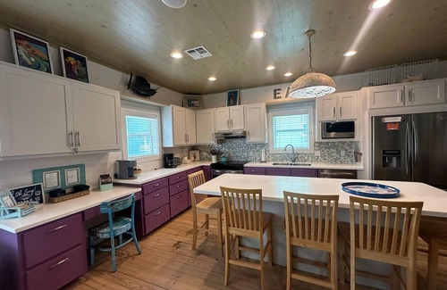 Ascend the interior stairs to the second floor, where you'll be greeted by a spacious open layout encompassing the kitchen, dining area, and family room. The fully stocked kitchen boasts a pantry closet for convenient storage of your groceries. Gather around the large island, equipped with five barstools, or opt for the 6-foot dining table for meals or game nights. Sink into the comfort of the extra-large sectional, which doubles as a queen-size bed for additional sleeping space. Step out onto the deck, take a seat on the relaxing barstools, and soak in the panoramic views and refreshing Gulf breeze.