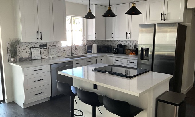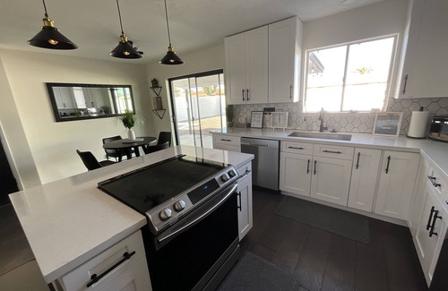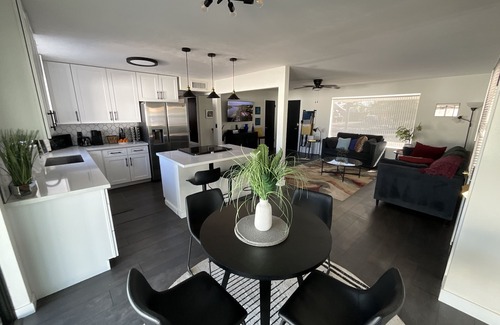 The home is named for the impressive beauty of the interior/exterior renovation completed in early 2023. Its tranquil backyard has custom fire features to keep you warm with plenty of seating for rest and relaxation while enjoying the stunning views of the Superstition Mountains and the amazing colors of the beautiful Arizona sunset. Nestled in a quiet neighborhood near Mesas best shopping, dining, and outdoor attractions, “Superstition Mountain Majestic Getaway” is the perfect home base for your adventure.