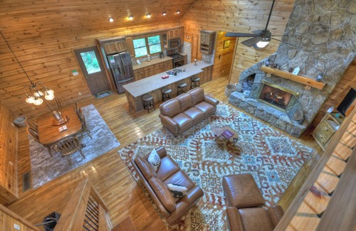 Listen to the rhythms of a CLEAR Mountain Stream from this spacious cabin perched grandly on the banks of rushing Wolf Creek. Calling all Bird Lovers--For your enjoyment the owners have added a bird watching area less than 4 feet off the screened in porch. "Easy" Entry to Main Level featuring expansive great room with floor to ceiling, double-sided stone fireplace, hardwood floors, oversized dining area & ALL WOOD interior. Multiple Skylights brightens up this upgraded Kitchen with Quartz Countertops,Gas Range,Tile Backsplash & Walk in Pantry/Laundry. Unique Open Loft Library & Gallery(6-Floor to Ceiling Windows). Main Level King Master with Fireplace, Walk in Closet, Double Bath Vanity & Tile Shower; additional King and Queen bedroom with a shared bathroom all on main level. Step out to the porch and relax in the hot tub, sit around the OUTDOOR TV, or lounge in the day bed. This cabin truly has everything- you won't want to leave! END OF ROAD PRIVACY
