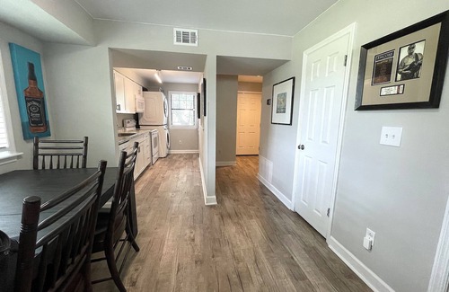 The kitchen is fully-equipped includes full-size refrigerator/freezer with an ice-maker, a combination coffee machine and ample kitchenware. Located upstairs, the first bedroom features a new king size bed with a DreamCloud mattress and a full size bath. The second bedroom features a queen bed and two twin-sized built in bunk beds. In addition, we have a self-inflating, queen-sized air mattress available to accommodate additional guests. This property includes full access to a community pool for use during the spring/summer seasons. The main floor living room has a smart tv and a turntable/sound system with a large selection of vinyl LPs your entertainment (including a unique selection of legendary local bands) and a phone charging station. A half-bath, located on the main-level, adjacent to the dining room, which includes a full dining room table that seats 4-6 as well as a bar area that seats 3 additional guests. Located off the main living area is a patio to enjoy your morning coffee or an evening cocktail! We would love to have you visit our condo and experience all that Athens has to offer!