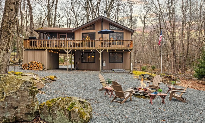 Welcome to Atlas Point Lodge, your serene Pocono Mountains getaway designed for comfort, connection, and a touch of indulgence. Tucked into a quiet wooded neighborhood just minutes from lakes, hiking trails, and year-round outdoor adventure, this charming three-bedroom home is the perfect base for families or friends looking to unplug and unwind.
