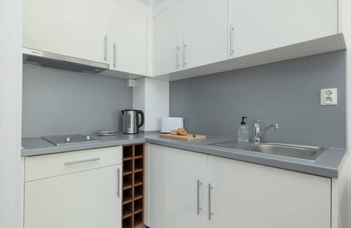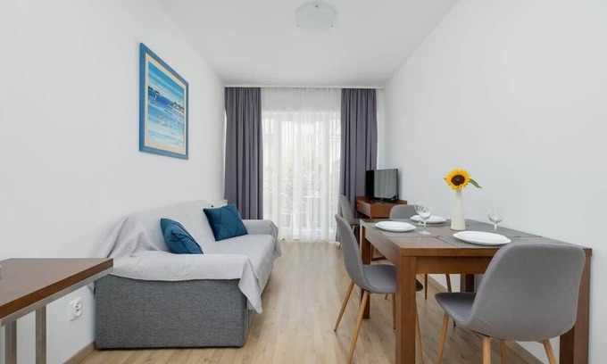 This stylish and elegant apartment sleeps four. It's an excellent choice for parents traveling with children, couples, or groups of friends. Decorated in light shades of gray, beige, and white, the interior is both aesthetically pleasing and comfortable. The apartment features one bedroom with a large, comfortable double bed with two single mattresses and storage for small items. The air-conditioned living room features a double sofa bed, perfect for relaxing in the evening while watching terrestrial television. The room also features a desk with a TV, a dining table with chairs, and a coffee table. The living room opens onto a furnished balcony, perfect for enjoying a morning coffee in a cozy atmosphere or relaxing outdoors during a break from the day's activities. Meals can be prepared quickly and easily in the kitchenette, which is equipped with appliances such as an induction cooktop, an electric kettle, and a refrigerator with a freezer. In the bathroom, guests will find a welcome set of toiletries, including towels, a shower, and a hairdryer. The hallway features a spacious wardrobe, perfect for storing brought items. Guests arriving by car can use the public parking spaces located adjacent to the building. A playground is located directly below the balcony, providing convenience and safety for families with children.