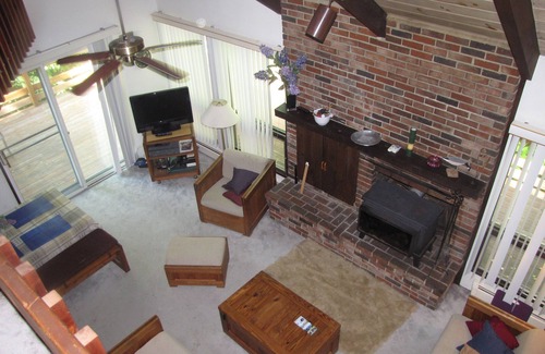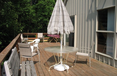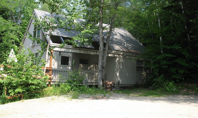 Minutes to STORYLAND - ON "ATTITASH". Secluded, rustic, Mountainside 4 bedrm Sleeps 10 in beds (2 BR's on 1st floor, 2 BR's upstairs plus a loft that sleeps 2). NO BUNK BEDS. 2 full bathrooms, (1 full bath on each floor). Sheets, Towels NOT provided...Tons of parking. Convenient to everything in the valley. 5 flat screen TVs, internet, WiFi, AC, living area w/cathedral ceiling, sliders to a SCREEN porch, leading to a HUGE wrap around deck with grill overlooking a picture-perfect STREAM. No W/D. Read reviews. GREAT FOR GROUP OR LARGE FAMILIES. NO POOL