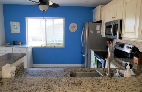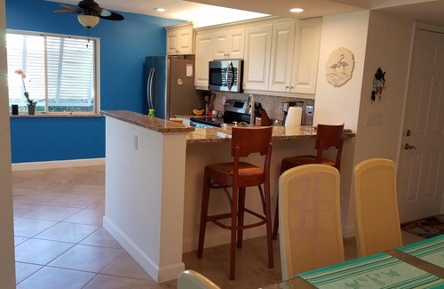 Our totally renovated, pristine villa, provides a multitude of pleasing features including a large, bright, open living space with a 55 inch smart TV with voice control remote. Double glass sliders lead to a large patio with outdoor furniture, attractive flowers and an unobstructed view of the golf course. Our living room boasts a reclining sofa and three single recliners for relaxing while watching TV or reading. Adjoining the living room and kitchen is a dining area with an attractive table that seats six. Floors are covered with large diagonal tile with the exception of carpeting in the bedrooms. The kitchen features an open concept with breakfast bar, custom cabinets, granite countertops, tile backsplash, recessed lighting, stainless steel appliances and is stocked with all the utensils any cook needs. A kitchen slider opens to the new screened lanai, with remote control light and fan, that provides enjoyable dining al fresco while watching wildlife and golfers. The Master bedroom has a queen bed, TV for your enjoyment, ensuite bathroom with two vanities and walk in shower. The attached den is a perfect spot for your computer or for reading. The guest bedroom has twin beds and access to the adjacent second bathroom. Both bedrooms have sliders to a private patio and all rooms have ceiling fans. Access to the laundry/storage room with a washer and dryer is through the den. Linens, towels, beach chairs, umbrella, beach buggy, cooler, and bikes are provided for your enjoyment. Short walk to the heated community pool. There are weekly and monthly social activities at the pool. Many beautiful public beaches, with free parking, are within a 15-minute drive as well as several public golf courses. Venice features wonderful restaurants, parks, Venice theater, Venice Performing Arts Center, Venice Community Center, free concerts in the Gazebo in downtown Venice, fishing off the Venice pier and boutique shopping. We are a ten minute drive from Cool Today Stadium for the Atlanta Braves Baseball Spring Training. The stadium features a lovely Tiki bar and different musical entertainment throughout the year. When here in Venice, we say, "another day in paradise". Come see for yourself. ** The Augusta Villas HOA requires all renters to submit a rental application with a $150.00 fee directly to them, at least 30 days before rental begins. Upon confirmation of rental agreement, we will send the application to you.