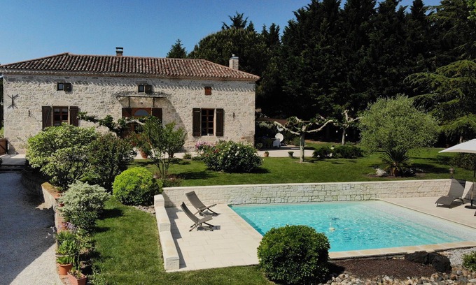 We offer a beautiful, tastefully decorated room with king-size bed, ensuite, private entrance and access to our pool and garden. Our house is a restored 17th century maison de maitre in a quiet, rural location in the Lot et Garonne. We are 20 minutes from Agen, 1.5 hours to Bordeaux, 1.5 hours to Bergerac and only minutes to the train stop at Port Sainte Marie. We are close to attractive villages, with many hosting night markets in summer.
