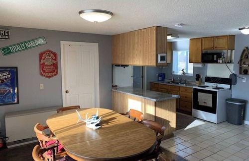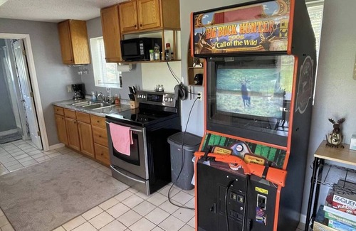 Peaceful cabin in the woods. Two bedrooms with queen beds in each. 2nd bedroom has queen bed and 4 twin bunk beds. Kitchen is fully stocked with pots and pans, coffee maker, plates, bowls, glasses, silverware and utensils. Bedding is provided along with dish towels, and bath towels. Multiple dvd's available for your enjoyment. As well as a classic Atari gaming system, and Smart TV for streaming your favorite shows. Full-size Big Buck Hunter arcade game set up for free play.Bluetooth speakers for streaming music while playing cards, dice, or one of the many games provided. Heated 3 Season porch for hanging gear to dry along with boot dryers for drying boots and gloves. Fire pit and propane grill are provided. Large yard with parking for trailers and additional guests.