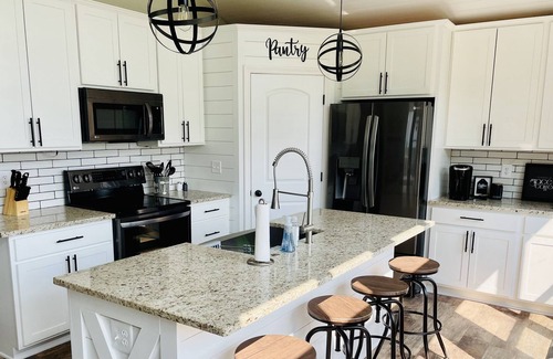 The Elm is tastefully decorated and fully furnished with everything you’ll need to enjoy your stay including freshly laundered linens and towels, well stocked kitchen essentials with a Keurig coffee maker, fun assortment of games and more. With 3 bedrooms and 2.5 baths, The Elm can sleep up to 7 comfortably. The layout is open and bright with a full wall of windows in the kitchen/dining area. The living room offers a sectional with an oversized ottoman. Sit back and enjoy your favorite shows from the 65 inch SMART TV. Multiple dining options available with seating for up to 10 at the dining room table, 4 at the kitchen island and additional seating for 6 on the back deck. The open kitchen is fully stocked with pots, pans, dishes, glasses and flatware for all your cooking needs. If you don’t mind cooking, there are plenty of restaurants to fit every price point within a 10-25 minute drive.