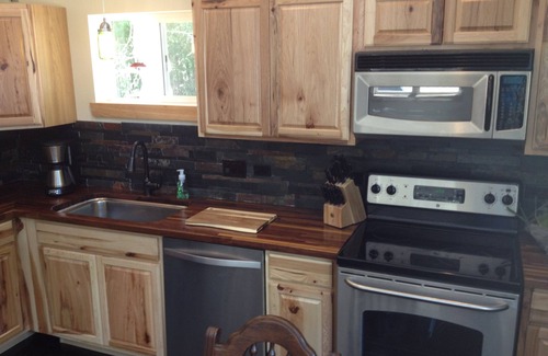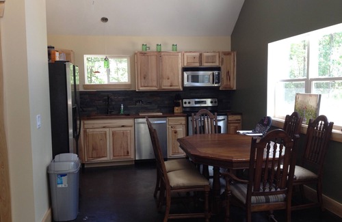 Welcome to our beautiful piece of the Northwoods! Come stay at this brand new, built in 2014 cabin on a 3 acre wooded lot located on a private drive. This 1300 square foot home features 2 bedrooms, one bathroom, family room, and a huge loft to accommodate up to 12 adults. The Master Bedroom features a king size bed, while the second bedroom has a queen bed. Moving up to the loft, you find a double bed, two sets of bunk beds, and additional queen bed for your comfort. The kitchen has stainless steel appliances (fridge, stove, microwave AND a dishwasher), plenty of counter space for all the necessities of your cooking, with lots of room at the dining table to eat, entertain, play board games, dice, or cards. The cabin also has a washer and dryer for your convenience.
