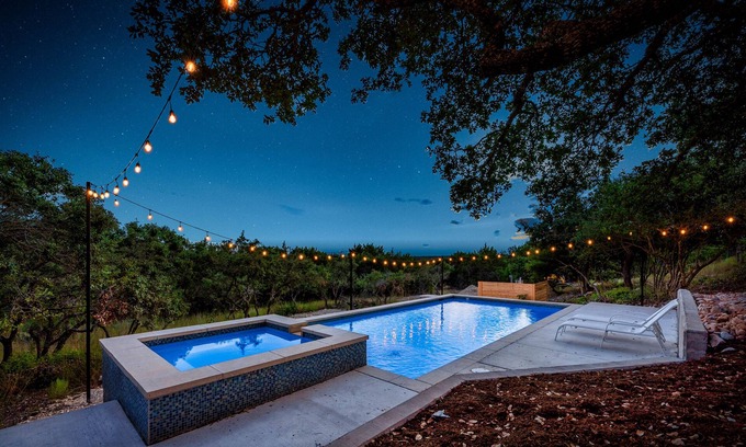 Stylish hill country getaway with amenities galore. This home features 6 bedrooms, 3 large bathrooms with plenty of getting-ready space, open floor plan, and views for miles. Outside you'll find a large covered deck that overlooks the greenbelt with magnificent sunsets and sunrises. You'll enjoy our sparkling pool and spa with a swim deck for lounging around. When the sun goes down you'll be gathering around the fire pit with family and friends!