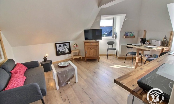 Your vacation apartment, located on the 3rd floor (no elevator), includes: Common Areas • Entrance hall with a library corner Inside the Apartment • Entrance hall with a step • Kitchen open to the living room • Shower room with bathtub and toilet • Bedroom with a 140x190 cm bed Outside • Covered parking is available just 200 m from the apartment (badge provided) A small pied-à-terre in the heart of Saint-Brieuc's town center, in the historic district, just steps from Saint-Étienne Cathedral. Ideal for a 2-night stay off-season (4 nights in summer), this vacation apartment is located in a characterful building occupied year-round by two tenants. A unique café (closed at 10 p.m.) enlivens the small square downstairs. Once you've parked your car, relax! Everything is within walking distance: markets on Wednesday and Saturday mornings, shops, restaurants, buses, and the train station are 1.7 km away. The charming Port du Légué awaits you, where you can enjoy Michelin-starred and non-starred restaurants, terrace bars, markets, or strolls along the marina. On the seaside, Rosaires Beach is 7.5 km away, and the seaside resort of Binic is 14 km away. With a 360° view of the Bay of Saint-Brieuc, the Pointe du Roselier, 8 km away, is an unmissable viewpoint. The entire bay, all the way to the end of Yffiniac Cove, is revealed before our eyes.