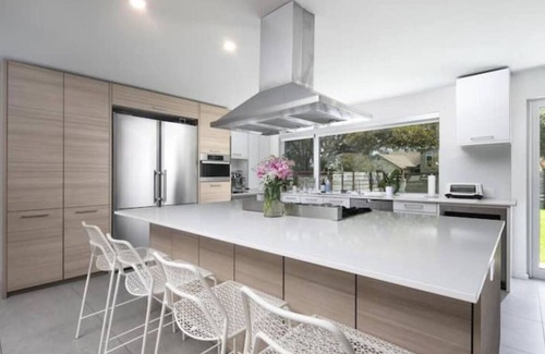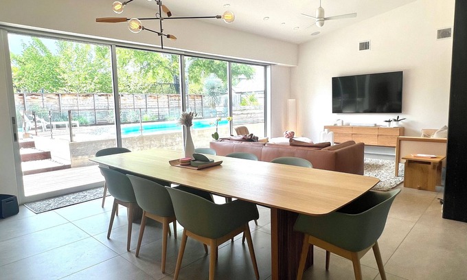 Enter to a wide open modern home with a luxury and spacious living room that accommodates up to 10 people. Beautiful modern high end furniture and a 75’ LED TV where all can watch a favorite movie or show. The 14 foot ceiling living room/dining room area are connected and comfortably sits 8 people. Fall in love with the 20 foot four glass panel door that opens to the outdoor deck and pool. Enjoy a fun day in the pool, in the outdoor covered dining/grill area, workout on the Spin Bike, Cross-Fit Rig, or relax on the space for yoga. Have the kids play in the front fenced yard. There is a spot for everyone to enjoy.