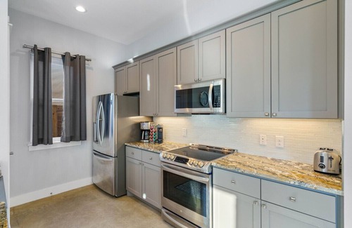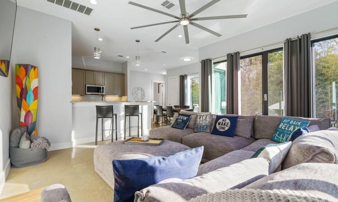 Whether you're visiting for a festival, game day, or a relaxing getaway, Austin Oasis Escape offers a perfect balance of lake tranquility and city excitement. Austin Oasis Escape vacation rental is a thoughtfully designed 3-bedroom, 2.5-bathroom retreat with everything needed for a comfortable and convenient stay. The first floor features a spacious living room with walkout access to a large backyard, perfect for relaxing and enjoying the views with friends and family. The modern kitchen is equipped with high-end appliances and fully stocked with all kitchen essentials. There’s also an in-home washer and dryer and a convenient half bath on this level.