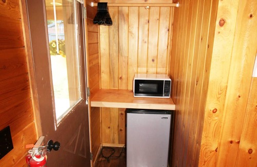 The cabin was completely updated in 2022 and is very clean. Small but very well appointed. It has a kitchenette (no stove) and bath, complete with tile shower. The queen bed is comfortable and offers amazing views of the surrounding landscape. Original pine walls provide a warm, rustic ambiance. Outside there's a wrap-around porch for all seasons, complete with deck chairs and a picnic table. We have a friendly Lab, Lulu, who occasionally roams the property.